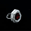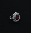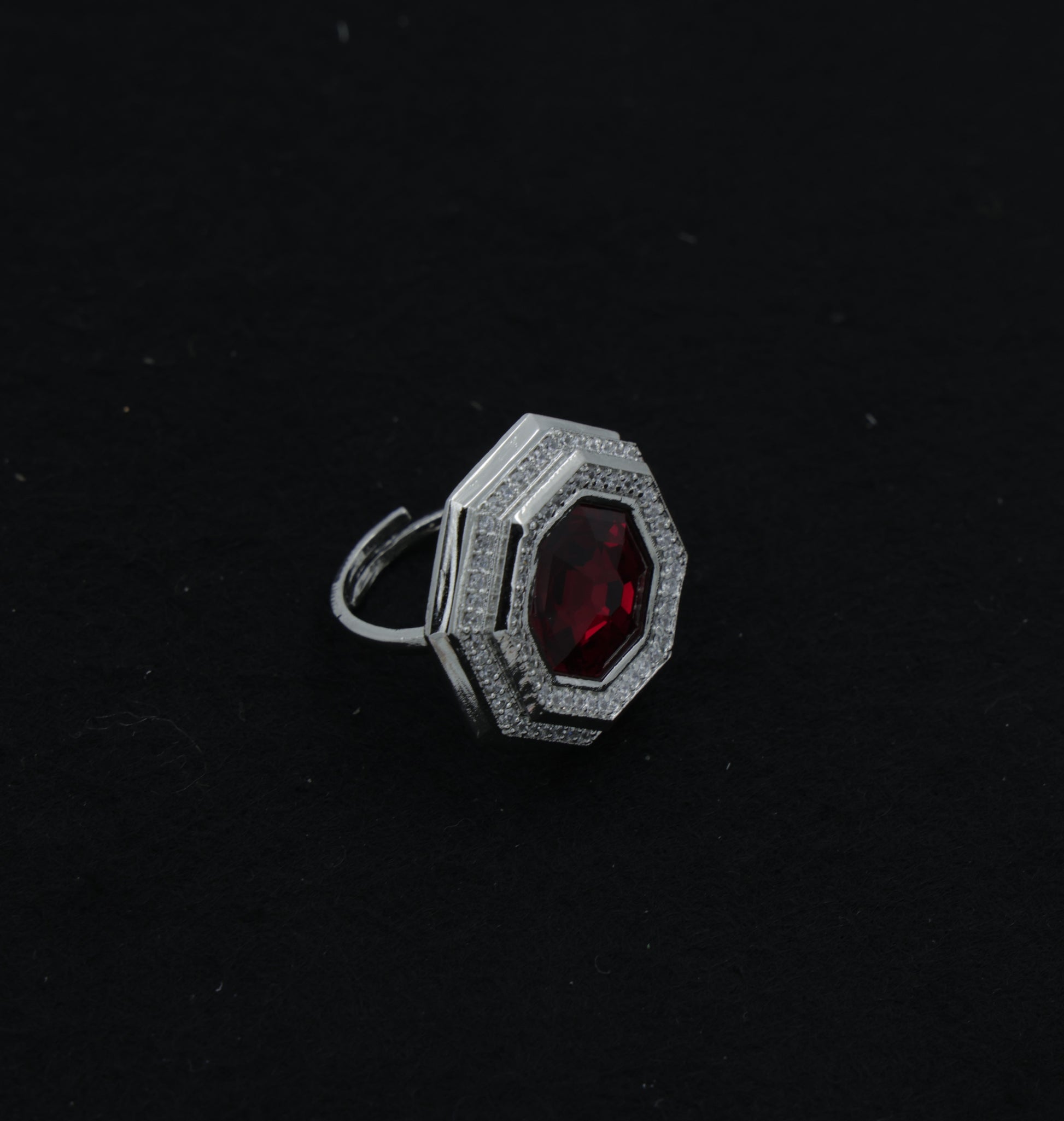 The Crimson Crown Ring features a rich ruby-red octagon-cut center stone, beautifully surrounded by concentric layers of white CZ stones. Set in a silver-toned adjustable band, this piece is all about power, poise, and perfection. A perfect choice for festive events, cocktail nights, or bridal trousseaus.