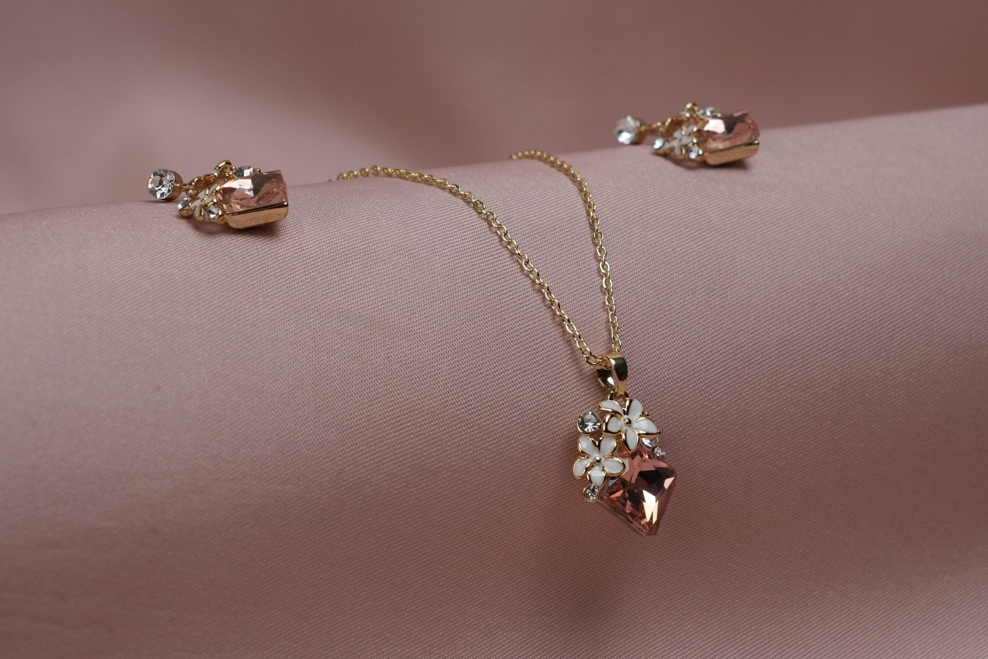 Elegance meets romance with the Rosé Blossom Set. A dazzling blush-pink crystal pendant, adorned with dainty white enamel flowers and sparkling stones, creates the perfect blend of grace and charm. The matching earrings complete the look, making it an effortless choice for women who love feminine sparkle with a timeless touch.