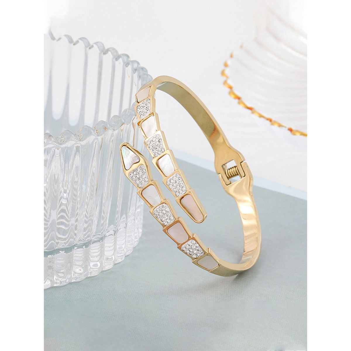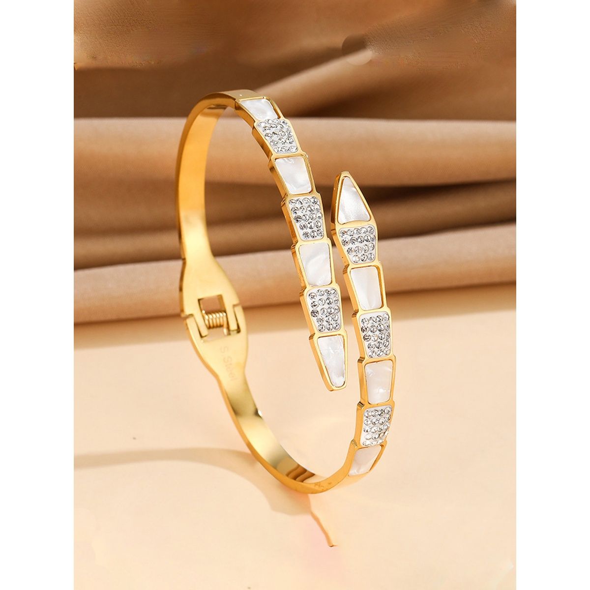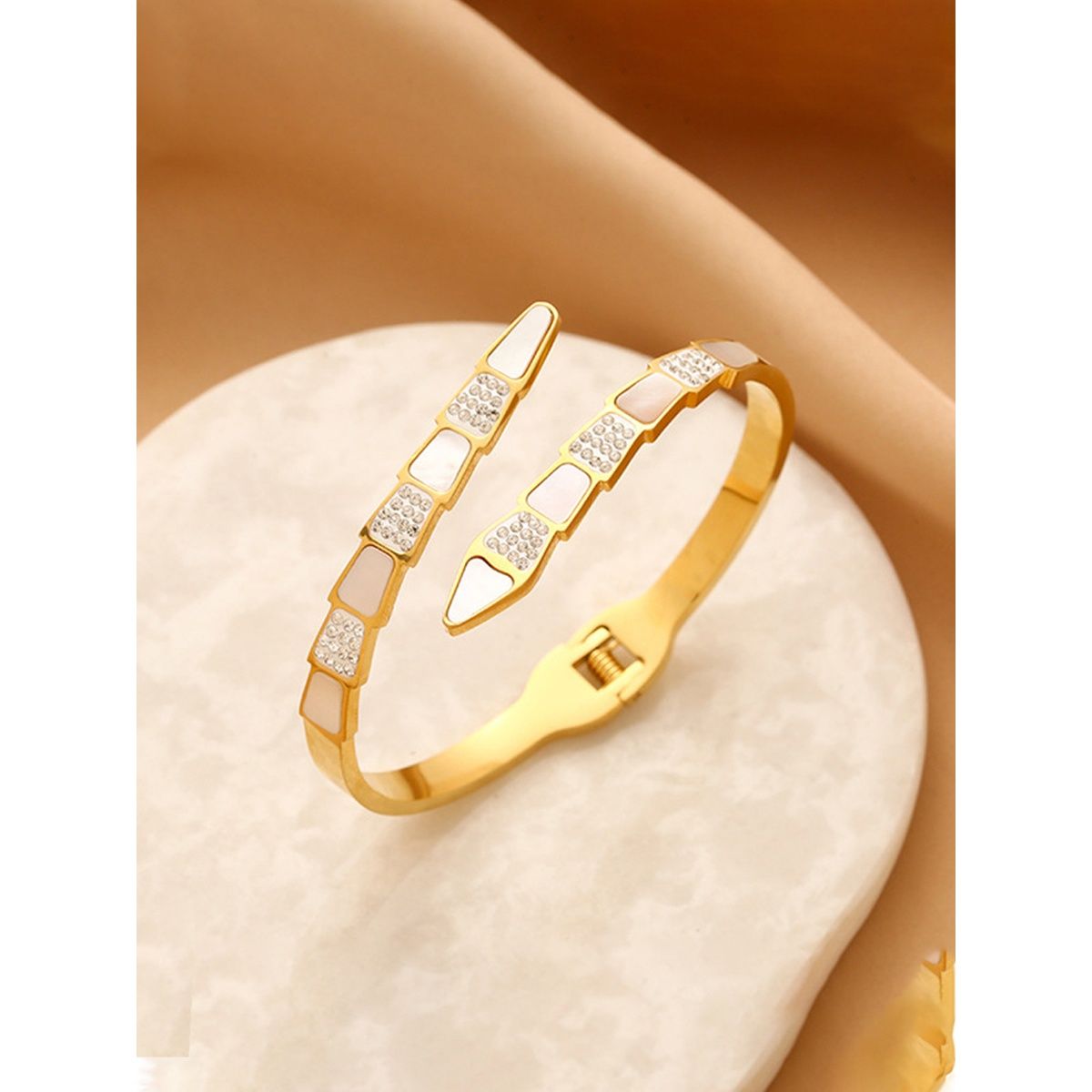 Delicate yet bold — the Aurora Bracelet is a true reflection of modern grace. Crafted in a radiant gold finish and adorned with luminous Mother of Pearl (MOP) inlays and sparkling Cubic Zirconia stones, this bracelet is made to turn heads without saying a word.