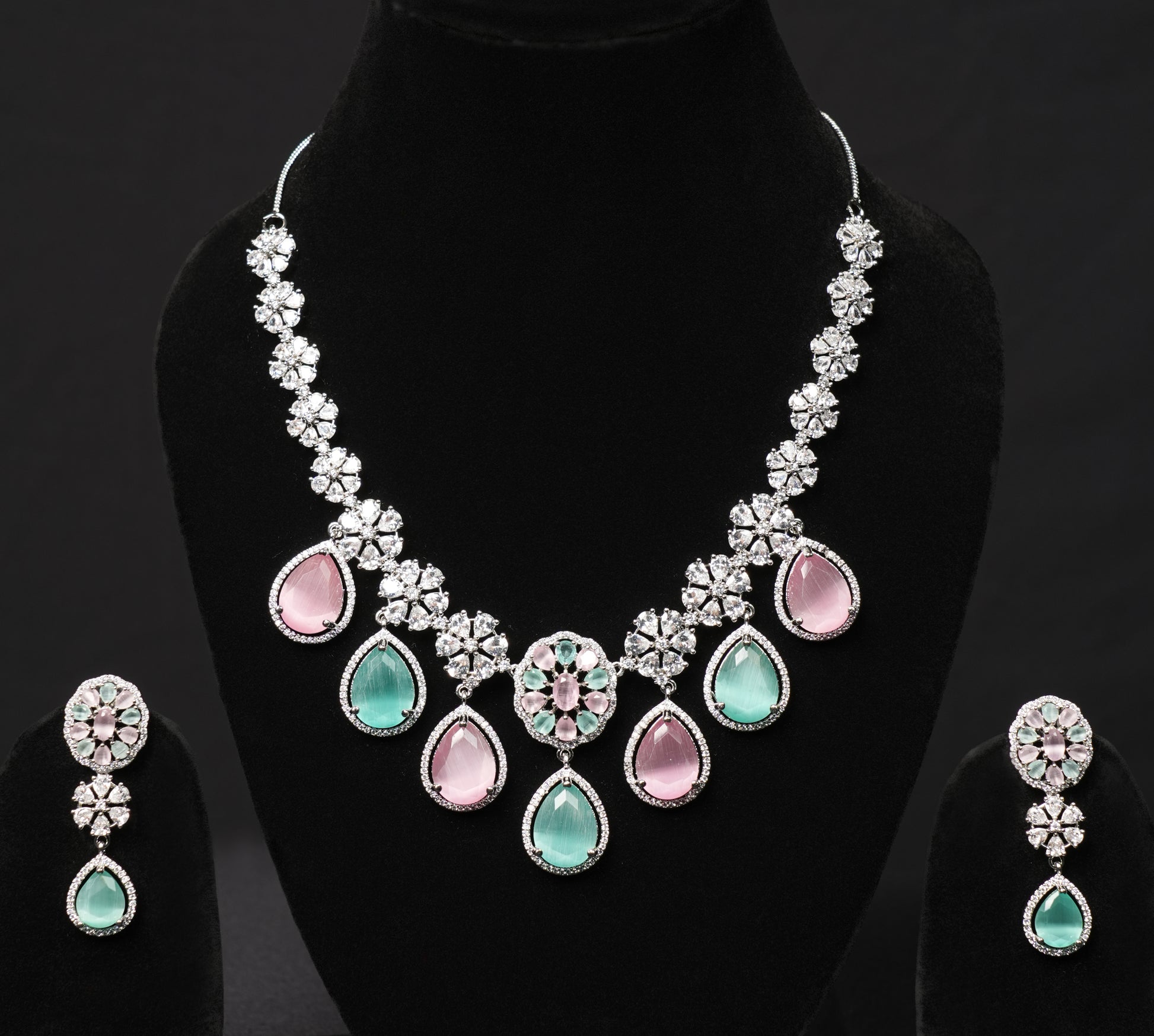 Step into the spotlight with our Pastel Bloom CZ Necklace Set, a breathtaking fusion of floral elegance and soft pastel glamour. This stunning designer set features a statement necklace adorned with mint green and blush pink teardrop stones, surrounded by brilliant-cut cubic zirconia. Matching floral motif earrings complete the regal look, making it perfect for both bridal and festive occasions.