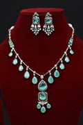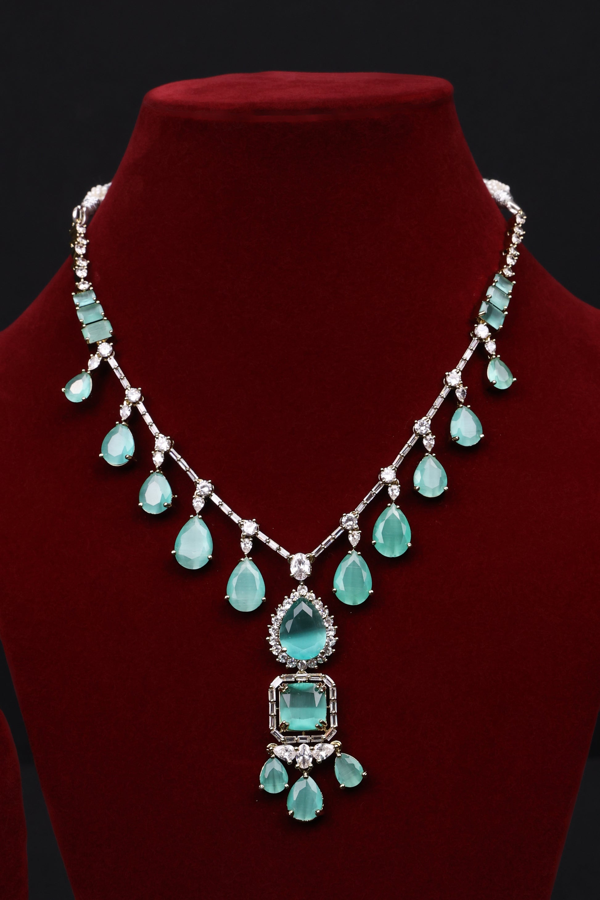 Step into luxury with the Celeste Royale Set - Mint Green Stone Necklace & Earrings, an opulent combination of refined design and regal sparkle. This statement jewelry set features a drop-style necklace and coordinating earrings, adorned with luminous mint green stones, clear crystals, and a beautifully tiered silhouette.