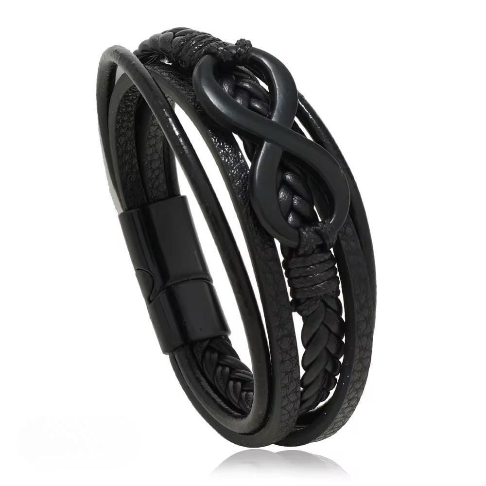 Make a statement with this bold and modern black leather bracelet. Designed with multiple leather textures and a sleek black infinity symbol centerpiece, this bracelet represents endless strength and unity. Perfect for casual wear, night outs, or as a meaningful gift. The secure magnetic clasp offers hassle-free wear while keeping your style sharp.
