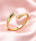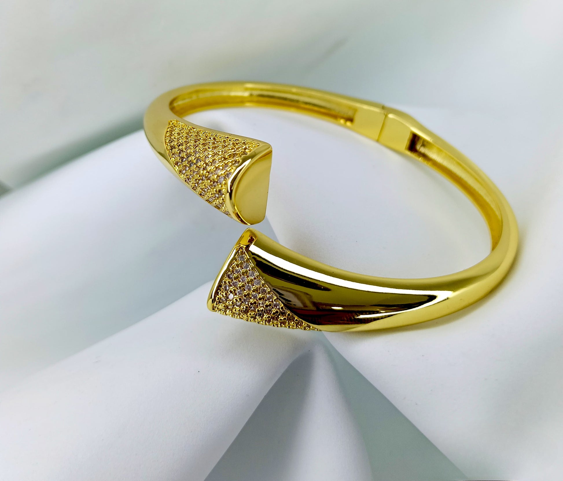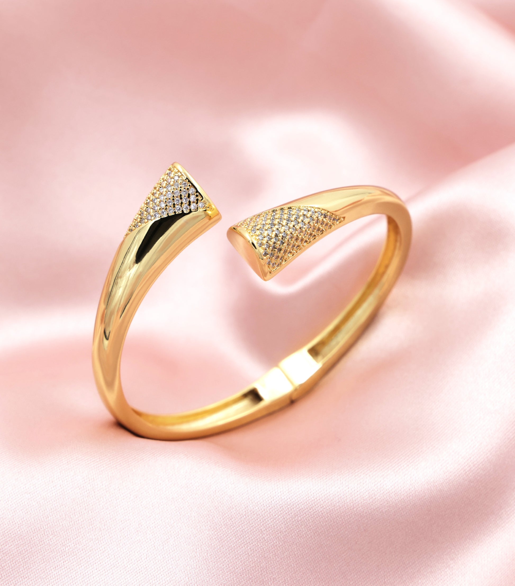 Step into timeless elegance with this dazzling open cuff bracelet. Crafted with a high-polish gold-tone finish, this piece features bold, geometric triangular ends encrusted with shimmering cubic zirconia stones. The sleek, modern design effortlessly blends luxury with everyday wearability, making it a must-have accessory for both casual and festive occasions.