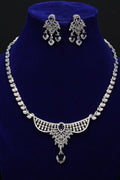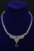 Embrace celestial elegance with the Celestial Twilight Necklace Set, a masterpiece of intricate craftsmanship and regal charm. Designed with dazzling white stones and deep sapphire-inspired teardrop accents, this silver-plated beauty exudes sophistication. The delicately structured necklace, paired with stunning chandelier earrings, makes this set perfect for weddings, gala nights, and special occasions.