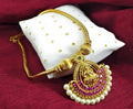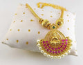 Elevate your aura with the Divine Radiance Temple Necklace, a timeless blend of tradition and elegance. Featuring an intricately crafted goddess motif at its center, this gold-toned masterpiece is adorned with rich ruby-hued stones and a delicate border of lustrous pearls. A striking emerald accent adds a touch of regal charm, making it perfect for festive occasions, weddings, or cultural celebrations. Embrace divine beauty and make a statement with this exquisite piece.