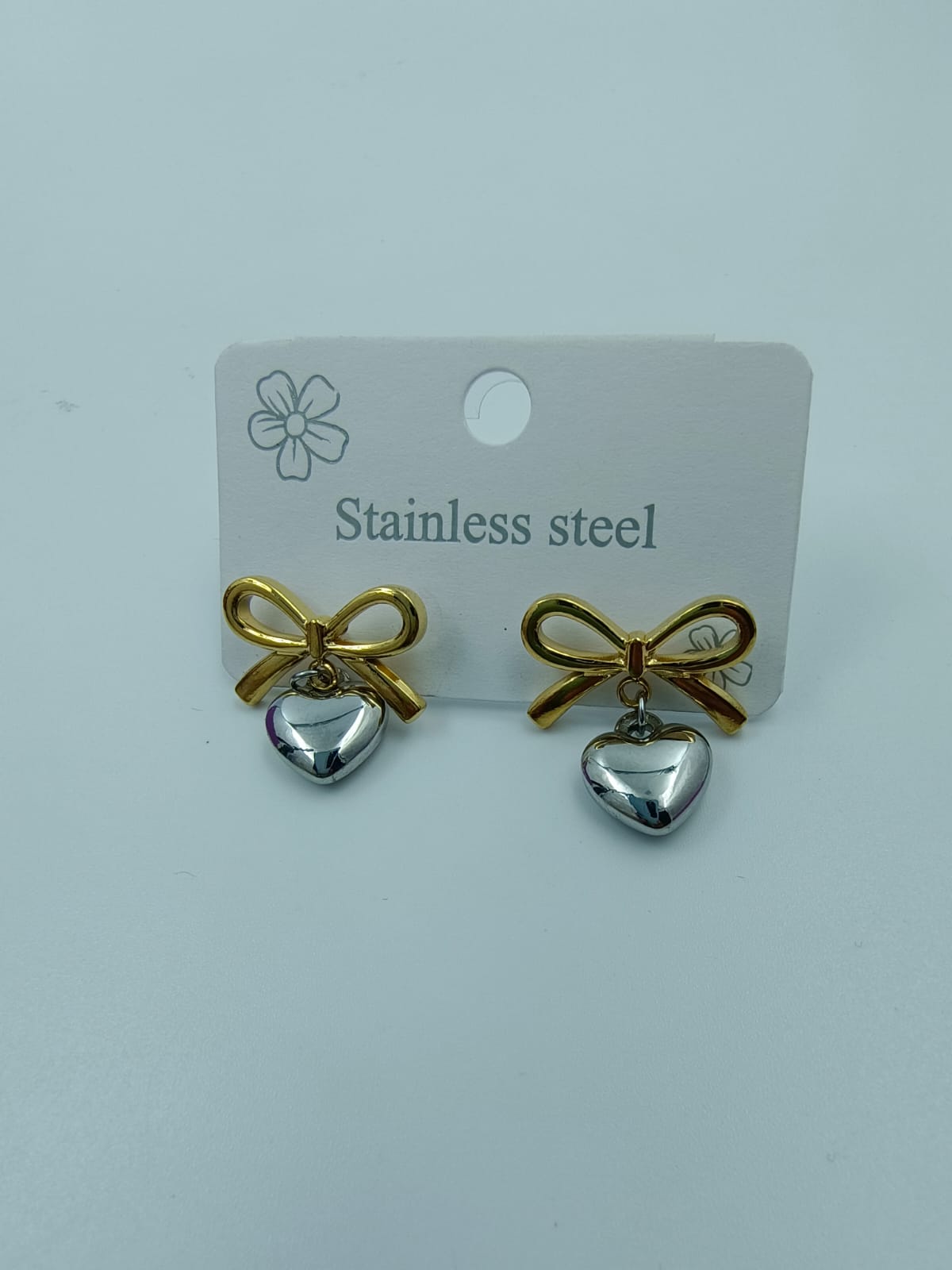 Delicate, charming, and absolutely eye-catching โ our Gold Bow & Heart Drop Earrings are the perfect blend of romance and elegance. Featuring polished silver-tone heart charms suspended from dainty gold bow studs, these earrings effortlessly elevate your style for any occasion.