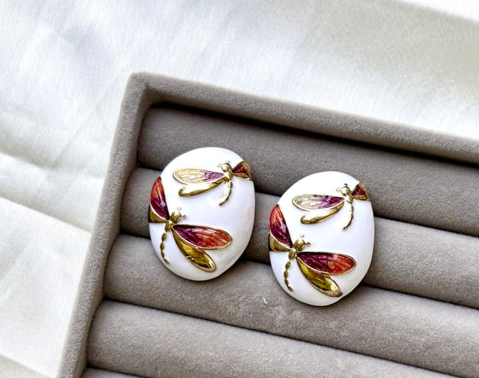 Featuring delicate dragonflies crafted in radiant gold and vivid crimson on a smooth white base, these earrings are a tribute to freedom, hope, and change. Lightweight and radiant, they bring a whisper of elegance to every moment.