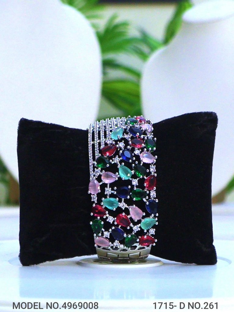 Elevate your style with this stunning multicolor gemstone bracelet, designed to add a vibrant touch to any outfit. Adorned with sparkling cubic zirconia and a mix of bold hues—emerald green, ruby red, sapphire blue, and blush pink—this bracelet is a true statement piece. The intricate detailing and premium finish make it perfect for festive occasions, weddings, and glamorous evenings.