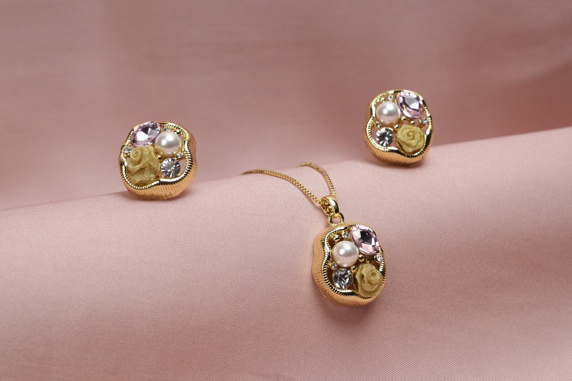 Crafted with glossy gold plating, this pendant and earring duo features a soft rose motif, glimmering CZ stones, a luminous pearl, and pastel pink highlights — creating the perfect harmony of grace and charm.