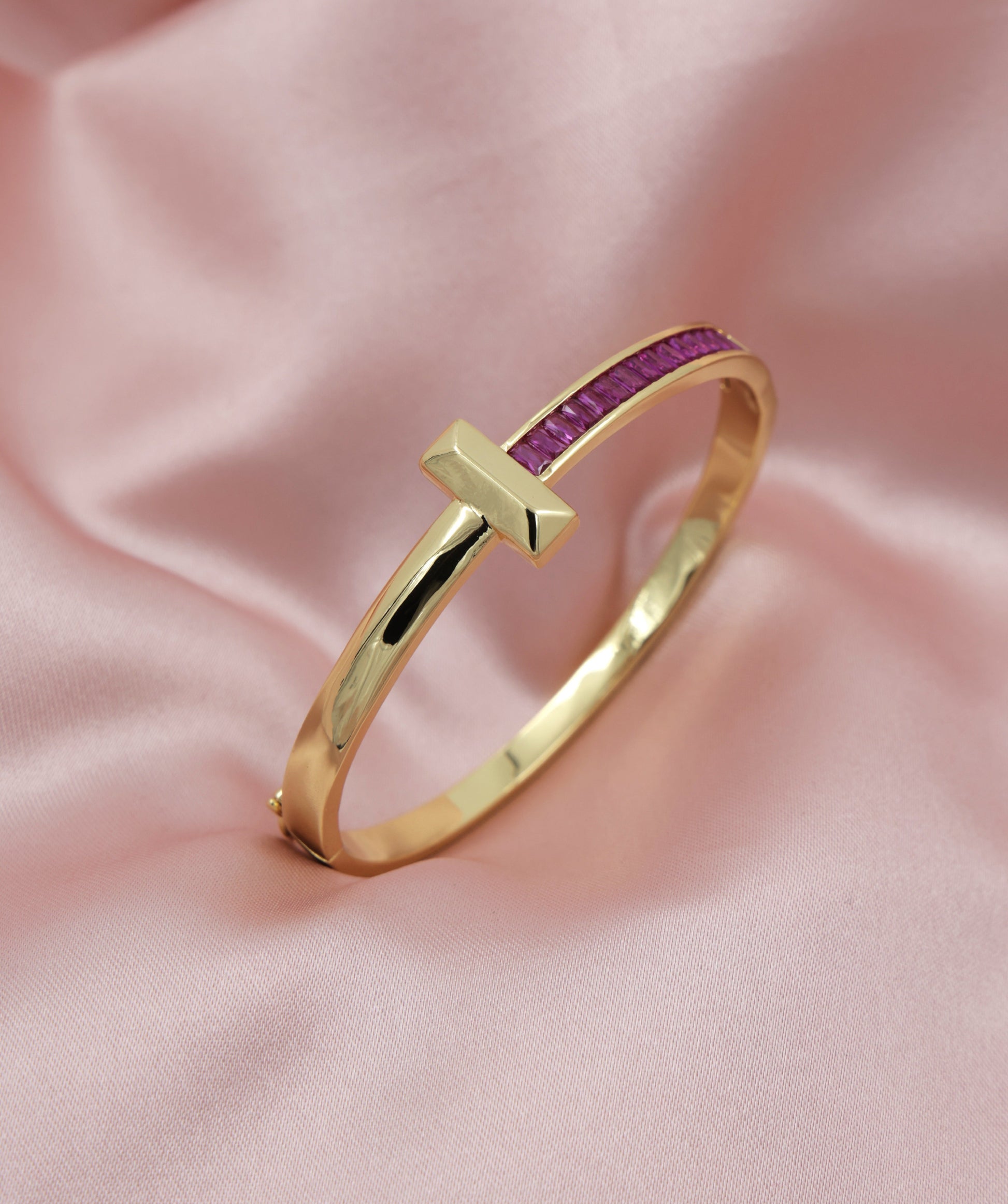 This striking piece features a row of channel-set ruby-colored baguette stones, running sleekly across a high-polish gold-finished bangle. Designed to make a bold, clean statement, it’s perfect for everyday luxury or chic evening looks.