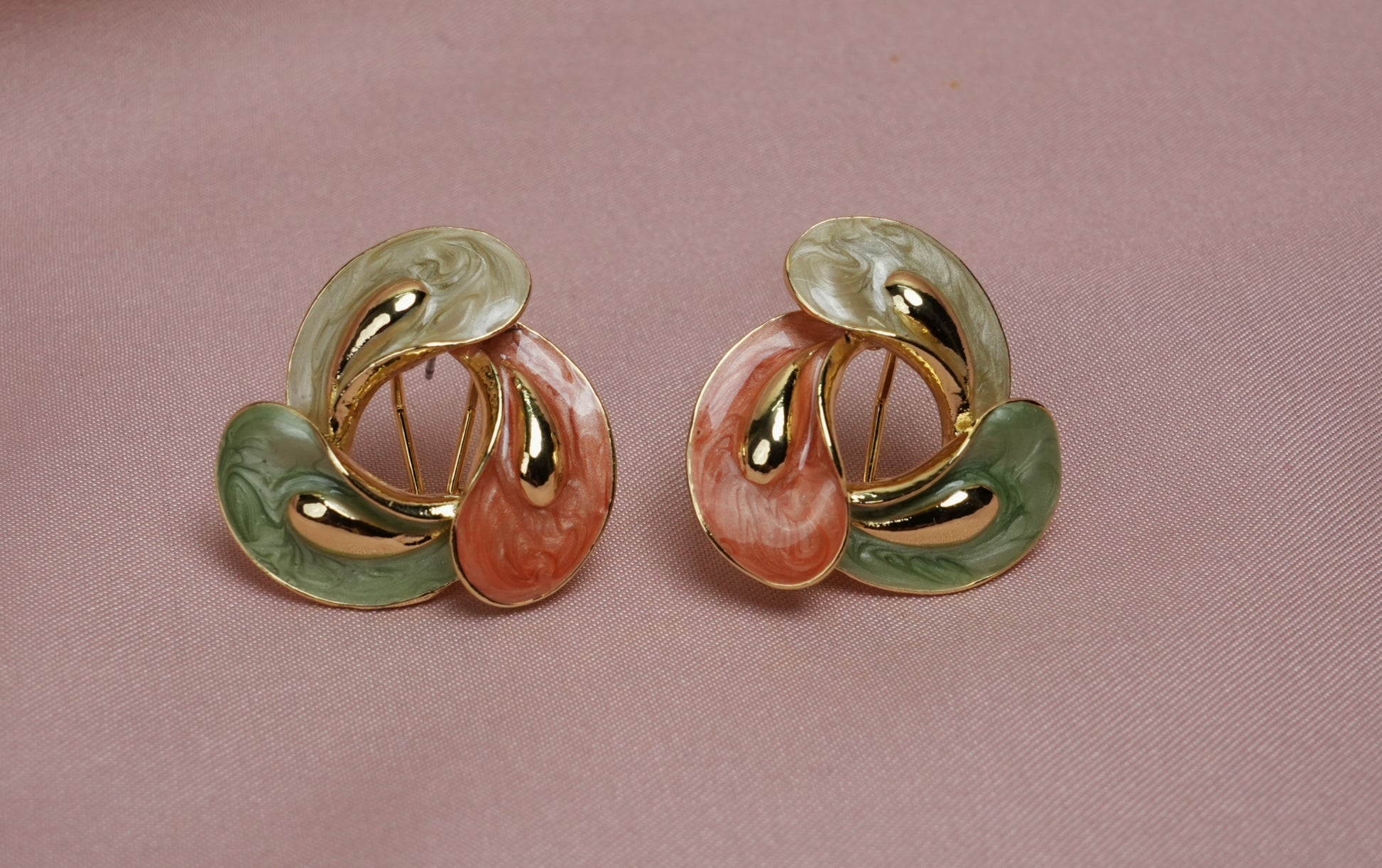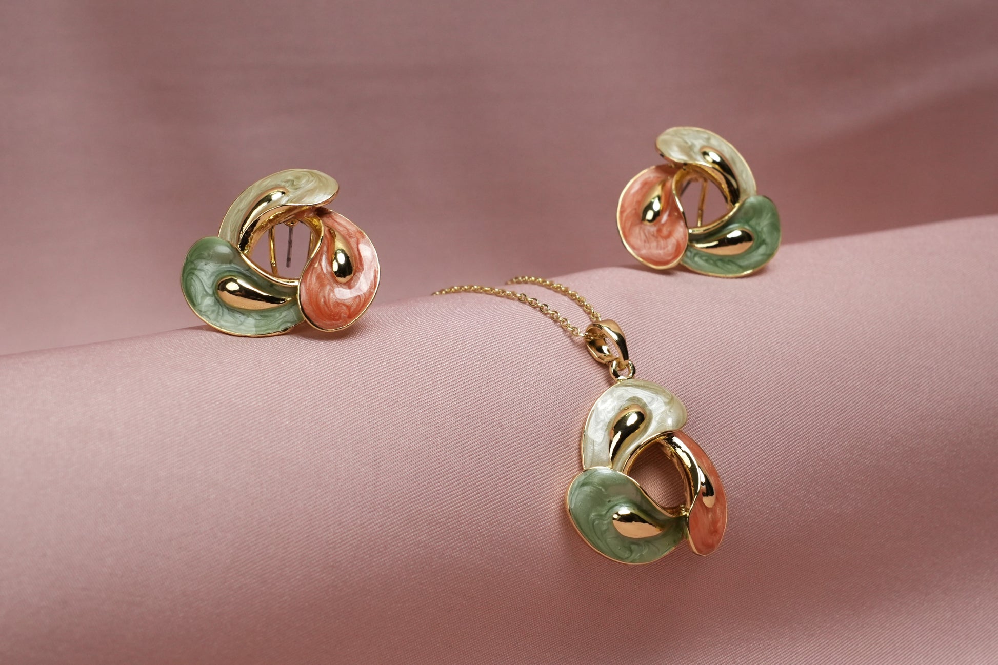 A perfect blend of soft pastel hues and glossy gold tones, this Tricolor Bloom Pendant Set is designed for women who love minimalist yet statement jewelry. The delicate swirl of sage green, blush peach, and ivory enamel adds a fresh twist to any outfit – from casual brunches to festive evenings.