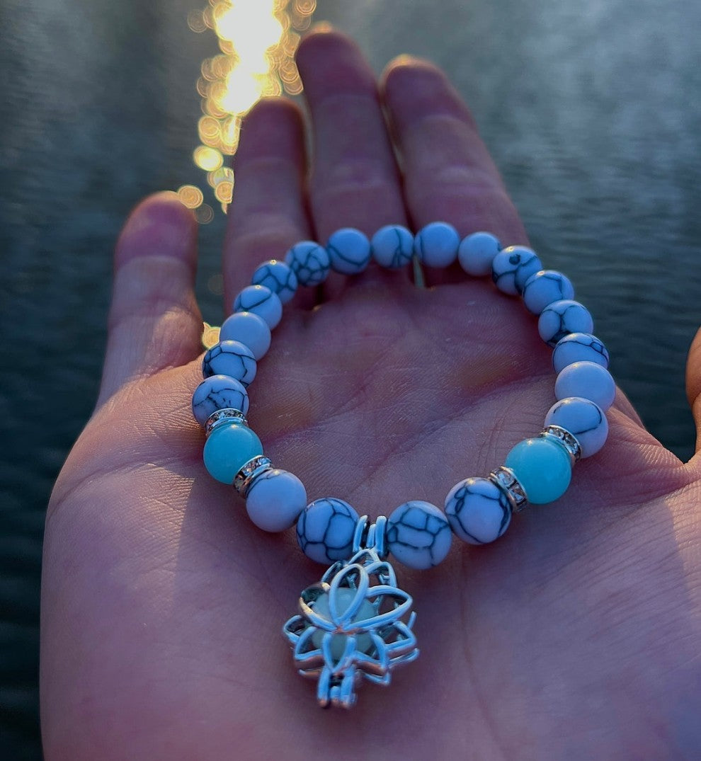 This handcrafted bracelet blends calming white howlite beads with luminous glow-in-the-dark accents and a silver lotus charm—a symbol of purity, growth, and spiritual awakening. Whether worn for its natural healing vibes or its elegant beauty, this bracelet is both meaningful and stylish.