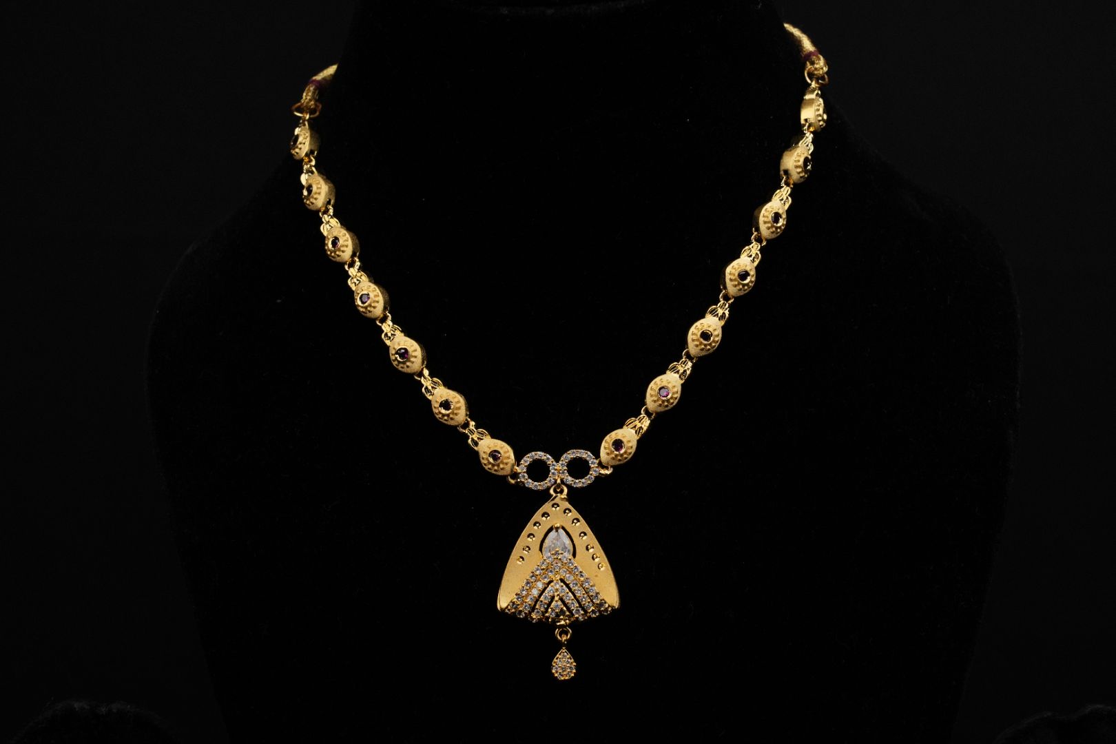 Add a graceful glow to your ethnic style with the Zaira Bloom CZ Necklace Set. Inspired by soft floral and petal motifs, this beautifully crafted set features a gold-polish finish accented with sparkling cubic zirconia and subtle ruby-toned details.